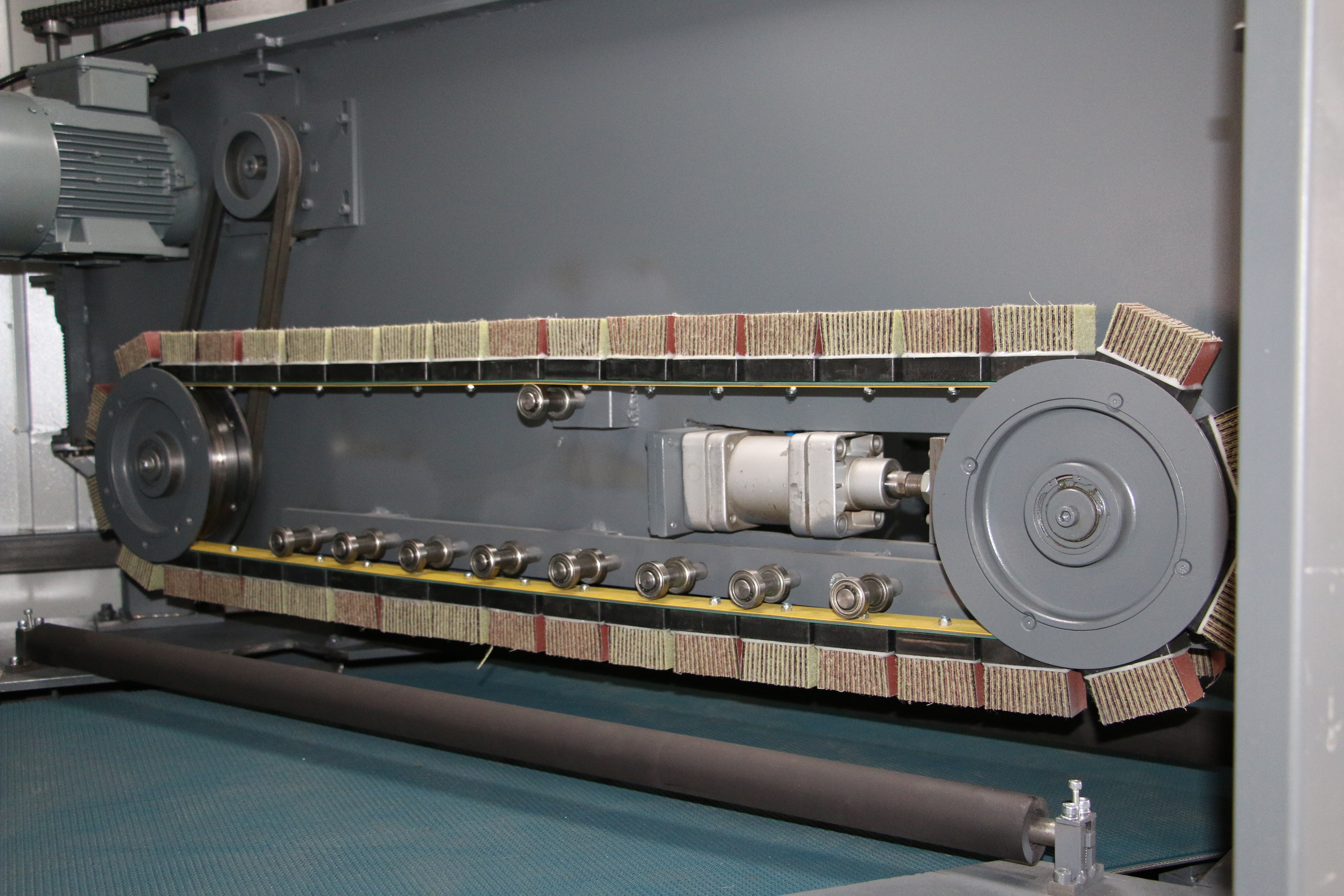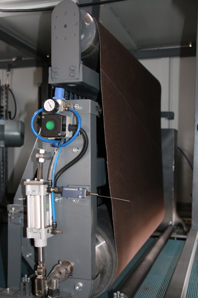 Özel olarak tasarlanmış aşındırıcı zımpara ve skocthlarla monte edilmiş iki adet özel çapraz kayışlar zıt yönlerde ilerleyerek parçanın kenarlarında ve delik çevrelerinde kenar yuvarlatmasını tamamlar. Aşındırıcılar daki aşınmaları telafi edecek ayrı bir yükseklik ayarına sahiptir.